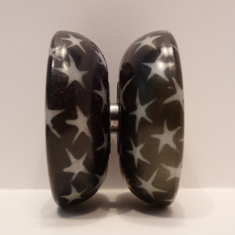 descriptionArtist, John Higby dyed the body of this yoyo and painted Ballistic caps with a glow Yodel motif on this one of a kind custom yoyo.